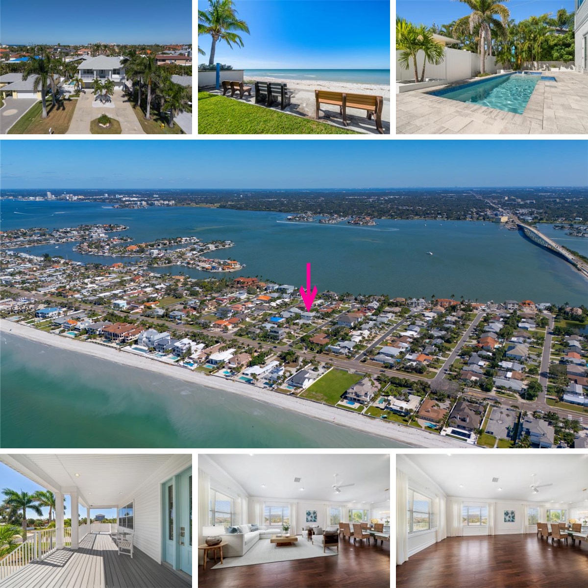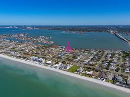 Experience luxurious coastal living in this exquisite custom-built home in the prestigious community of Belleair Beach, one of Florida’s most exclusive seaside enclaves. Offering elegant living and multiple entertaining spaces, this elevated residence was thoughtfully designed in 2016 to FEMA standards, providing peace of mind and minimal insurance costs with a main floor elevation of 17.5 feet. Just five houses from both the Intracoastal Waterway and the Gulf of Mexico, this ideal location allows you to enjoy postcard perfect sunrise and sunset views from the expansive covered front porch. Inside, the home’s refined craftsmanship is immediately evident — from hand-scraped hardwood and marble flooring, vaulted ceilings and intricate moldings to Abalone shell accent walls. Light-filled living areas and a gleaming white kitchen with stainless steel appliances, an island with seating, and abundant storage, flow seamlessly for effortless and impressive entertaining. An elevator adds convenience to the main floor. The primary bedroom is a luxurious retreat with a custom walk-in closet and exquisite ensuite with double sink vanity and walk-in shower. Additional bedrooms are filled with natural light and are equally well-appointed sharing a gorgeous hall bath with a tub/shower combo. The 4-car tandem garage features newly installed Polyaspartic flooring—and connects to a spacious pool entertainment room and gym. Step through French doors to your private resort-style pool, complete with splash pad, jets, and color-changing fountains, perfect for relaxing after a day at the beach or hosting guests. Enjoy the Belleair Beach lifestyle with resident-only beach parking, three private beach entrances, and a community center offering tennis, pickleball, and a nearby fishing dock—all just a short golf cart ride away. This exceptional, move-in ready property blends architectural sophistication with a relaxed coastal atmosphere—a timeless investment in luxury beachside living. Conveniently located close to shopping, restaurants and bridges.
